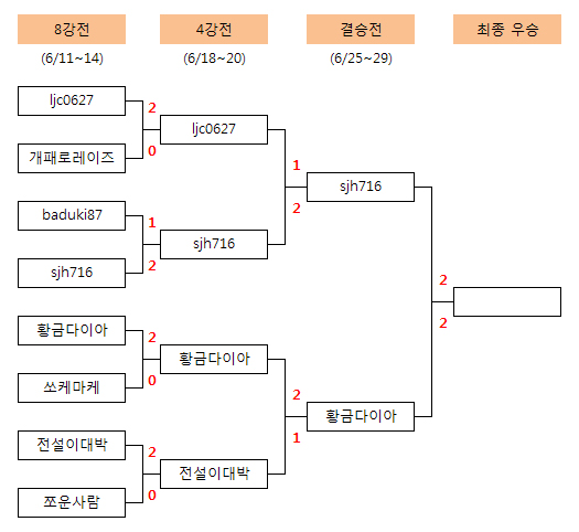 | 3국 | 6. 13(수) 오후 9시 | baduki87(1승 2패) vs sjh716(2승 1패) |