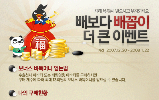 2008년 새해를 맞아 푸짐한 바둑머니를 받으실 수 있는 ‘배보다 배꼽이 더 큰 이벤트’ 를 진행합니다.