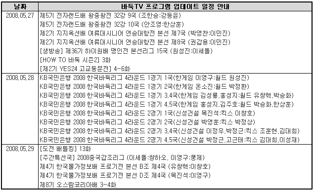 5월 5주 바둑TV 동영상 서비스 업데이트 일정을 안내해 드립니다.