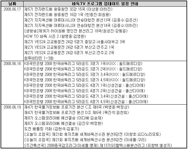 6월 3주 바둑TV 동영상 서비스 업데이트 일정을 안내해 드립니다.
