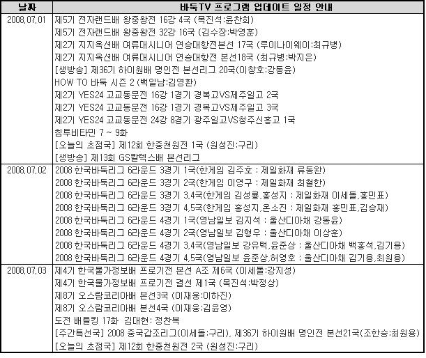 7월 1주차 바둑TV 동영상 서비스 업데이트 일정을 안내해 드립니다.