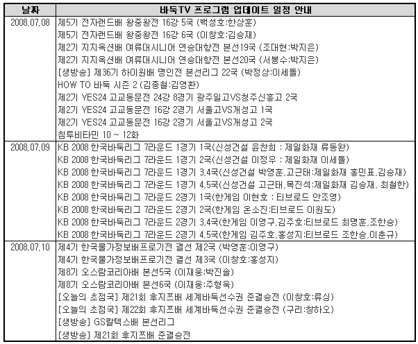 7월 2주차 바둑TV 동영상 서비스 업데이트 일정을 안내해 드립니다.
