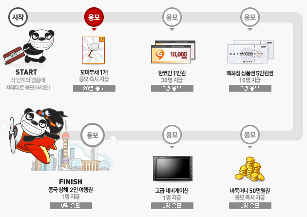 - 6단계(최종) : 중국 상해 3박 4일(2인) 여행권(1명, 이벤트 종료 후에 추첨, 동방항공 협찬)