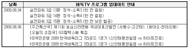 8월 1주차 바둑TV 동영상 서비스 업데이트 내용을 안내해 드립니다.