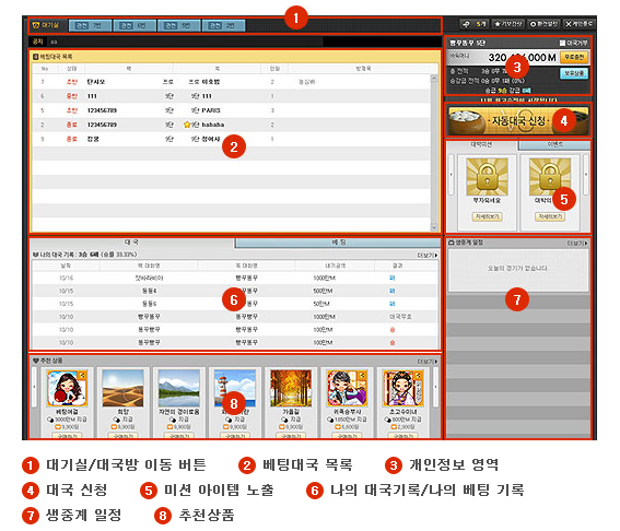 ▶ 간편실행 대국실에 입장하시면 아래와 같은 화면으로 구성되어 있습니다.