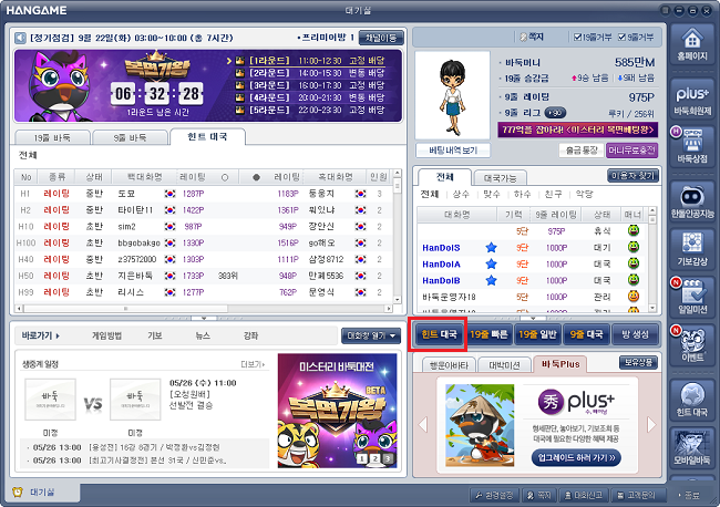 Step 1. 힌트대국 버튼을 통해 대국을 신청해주세요!