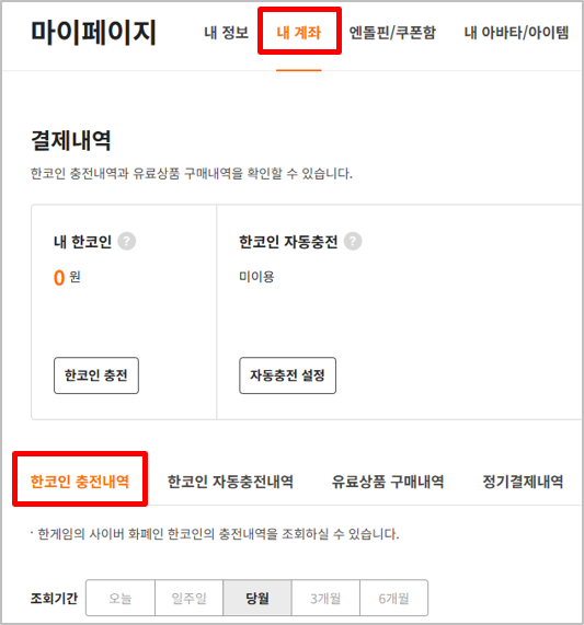 - 한코인 : 한게임 홈 > 내 정보 > 내 계좌 > 결제내역 > 한코인 충전내역