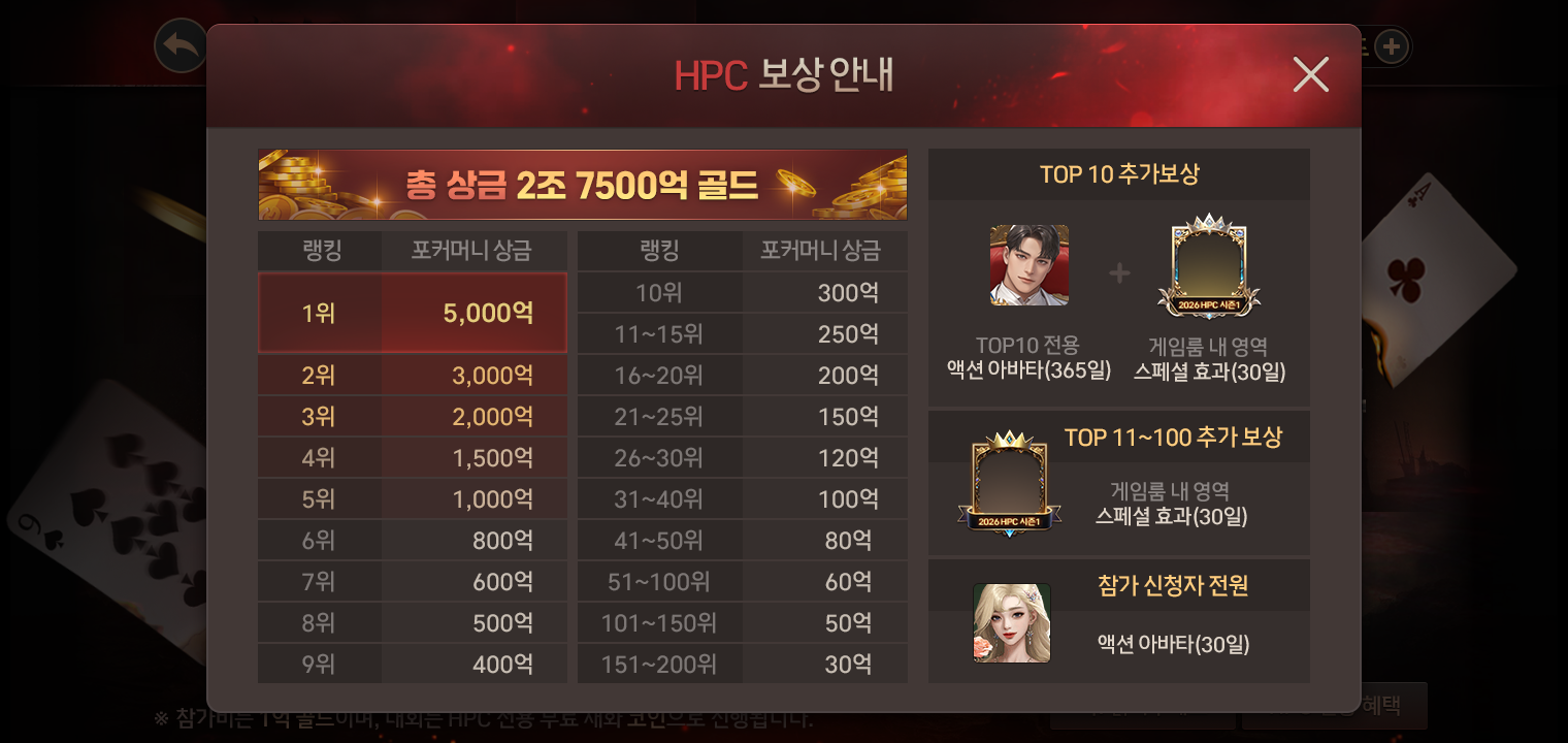 - 참가 신청 방법 : 게임 접속 → HPC 페이지 → [참가 신청] 버튼 클릭